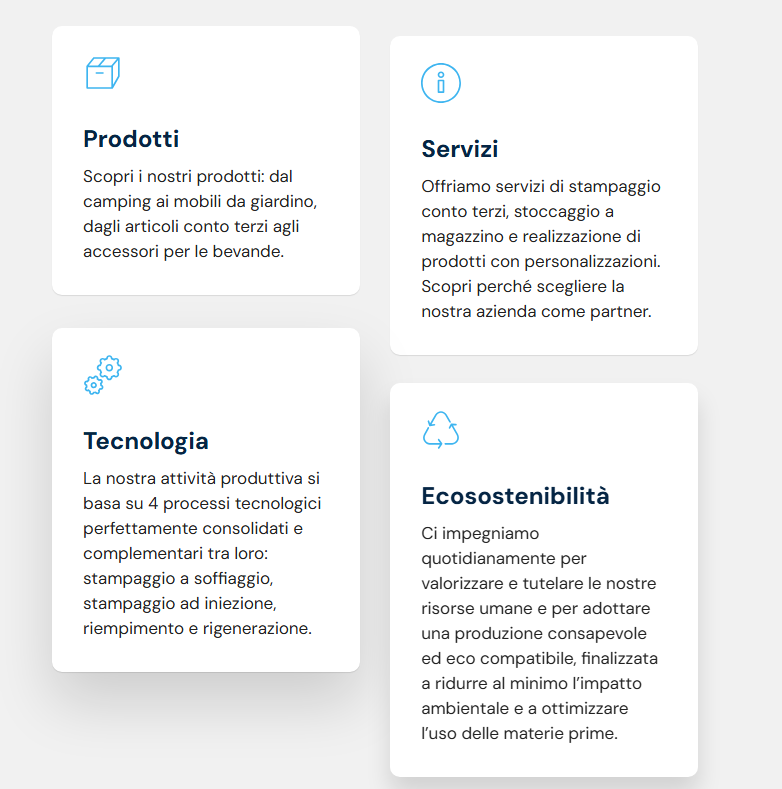La nostra vera forza consiste nel permettere al clientedi concretizzare un'idea. Siamo infatti in grado di offriresupporto alla clientela dalla progettazione allafinalizzazione dei prodotti plastici.